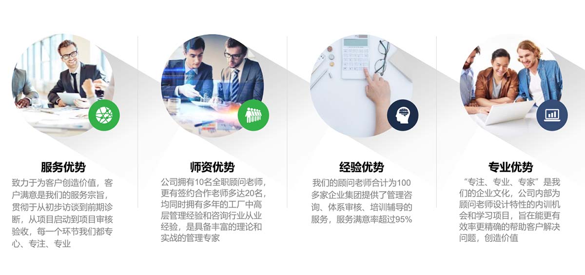 公司主营业务有:1.体系认证IATF16949、ISO9001、14001、45001、13485、27001、ROHS和咨询辅导;2.企业培训(内审员资质培训、6S管理培训、质量工具培训、精益生产培训、新员工培训);3.现场管理提升,如6S管理,质量管理,生产管理,仓库管理,供应链管理,订单管理等专题项目的提升改进;4.系统建立(帮助企业建立ERP,MES,WMS系统,并培训);同时公司还提供第三方检测(提供有国家CNAS资质的报告)、企业形象设计、计量器具校准,环评办理、国家排污许可证办理、劳务咨询、商标注册、知识产权申报、高新企业认证等配套服务。每个服务板块我们有专门老师对接,给到客户最方便快捷、高效的服务。